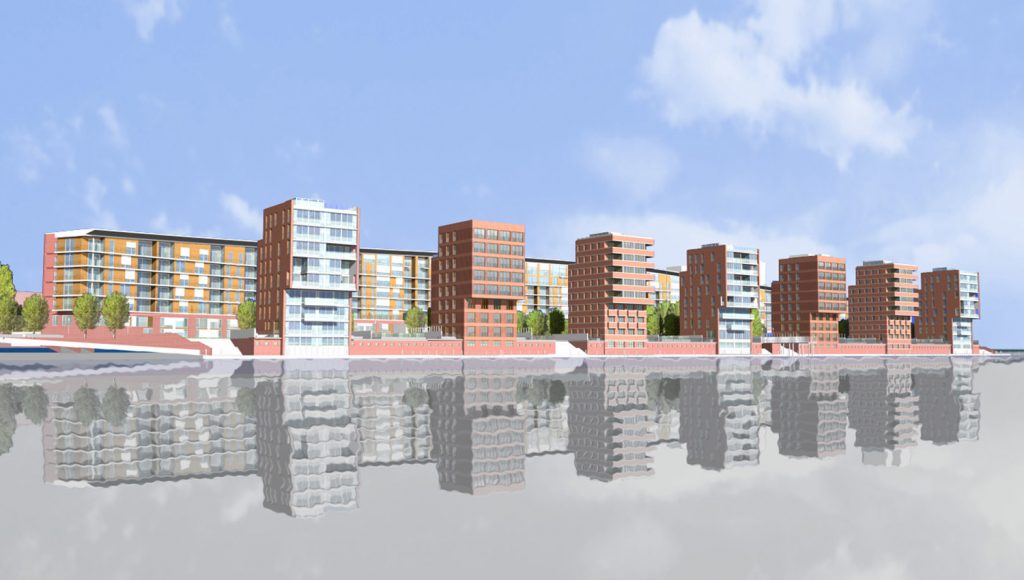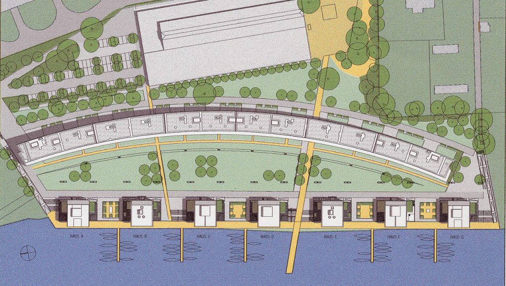 Das städtebauliche Konzept thematisiert den Ge- und Verbrauch ehemals industriell genutzter Flächen an einem brachliegenden Industriehafen mit dem Ziel, das Gebiet ohne Verdrängung wesentlicher Elemente des Bestandes umzudenken. Die sich wechselseitig störenden Nutzungen (Wohnen-Industrie) bestimmen das städtebauliche Konzept und die Ausformung der Neubauten in ihrer Lage zur Landschaft (Westen) und zum Industriegelände (Osten). Eine zum Wasser nach Westen hin geöffnete und gekrümmte, gestaffelte Wohnscheibe bildet eine Scheibe, vor die sieben achtgeschossige Türme direkt am Wasser an einem neu zu bauenden Kai gestellt werden. Diese Form lässt alle künftigen Bewohner der ca. 280 Wohnungen an der außergewöhnlichen topografischen Situation und der ungewöhnlichen Ausrichtung auf das Wasser und die Landschaft teil haben.