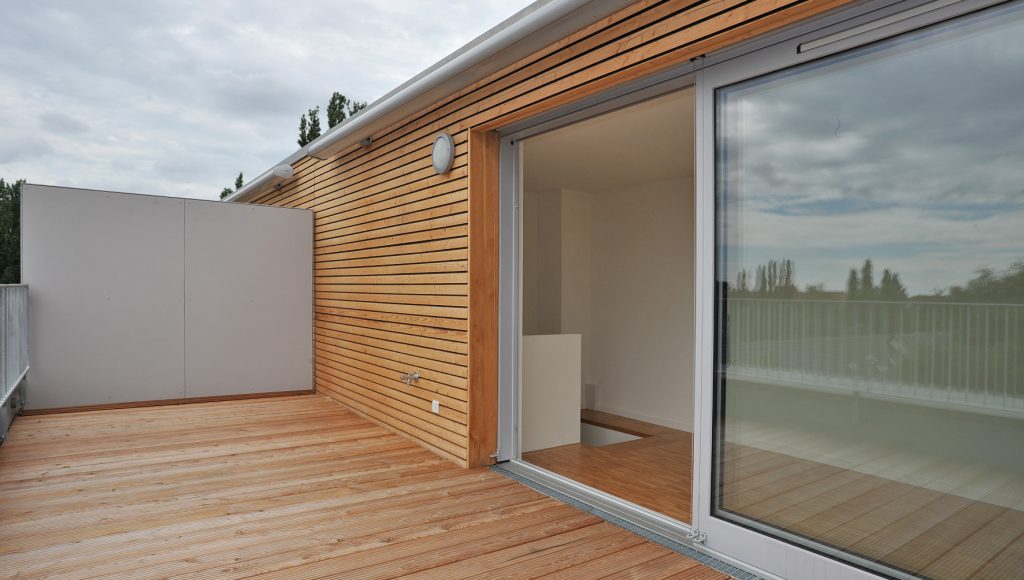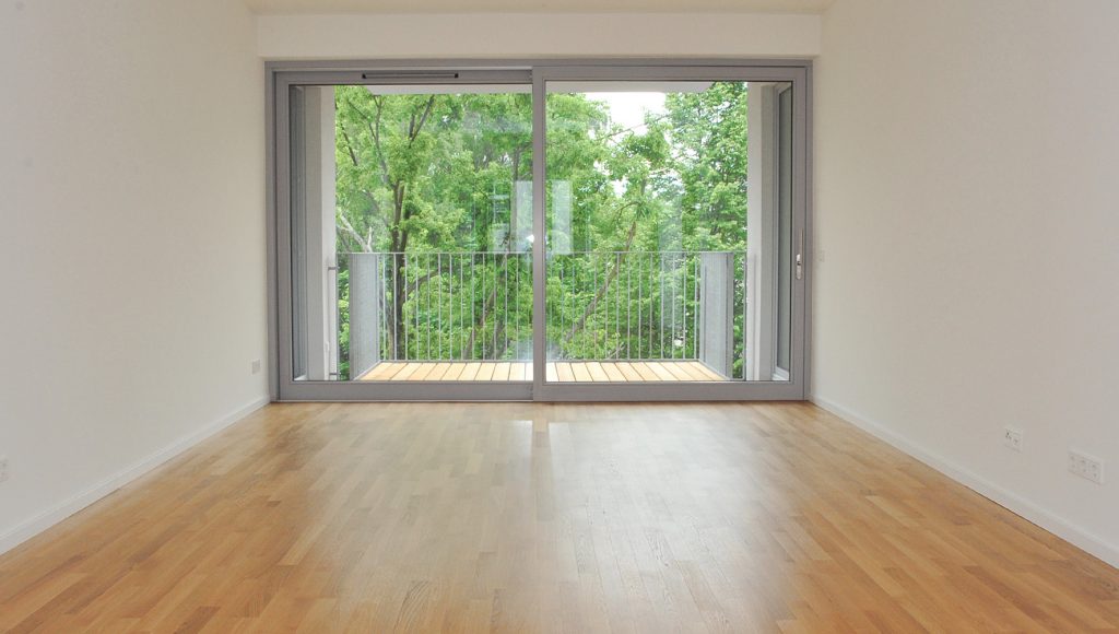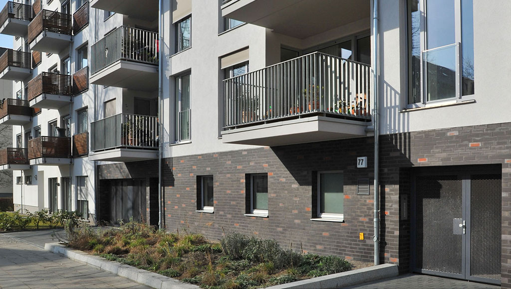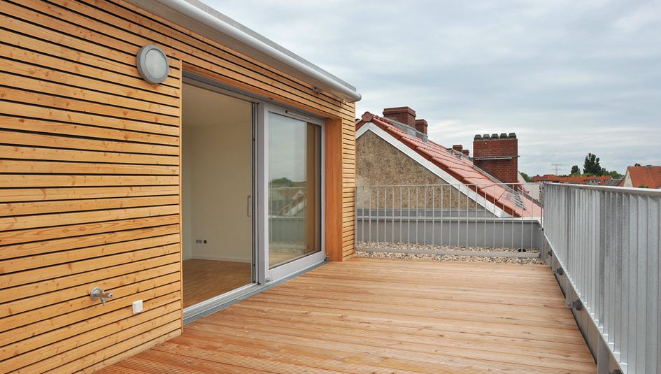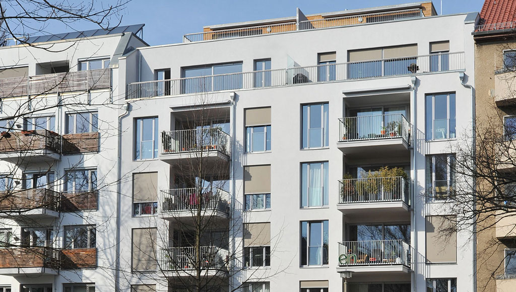Die Etagenwohnungen des 1. und 4. OGs haben nach Süden orientierte, großzügige Loggien mit einer Tiefe von ca. 2,60 m. Die Wohnungen im 5. OG verfügen über Terrassen, ebenso das Dachgeschoss. Alle nach Süden ausgerichteten Räume haben für eine gute Belichtung große, meist brüstungslose französische Fenster. Die Erschließung erfolgt über einen Durchgang zum Hof, von dem aus man das Treppenhaus und den Personenaufzug erreicht. Der Durchgang dient auch zur Erschließung der Hoffläche des Nachbargrundstücks. Im Erdgeschoß des nicht unterkellerten Hauses ist, neben großzügigen Stellmöglichkeiten für Fahrräder und den Abstellräumen der Wohnungen, ein Parklift untergebracht der Platz für 4 Stellplätze bietet. Die Grundrisse der Wohnungen wurden, im technisch möglichen Rahmen, zusammen mit den Käufern individuell gestaltet. Es entstanden 3-4 Zimmerwohnungen von 110 bis 119 m².