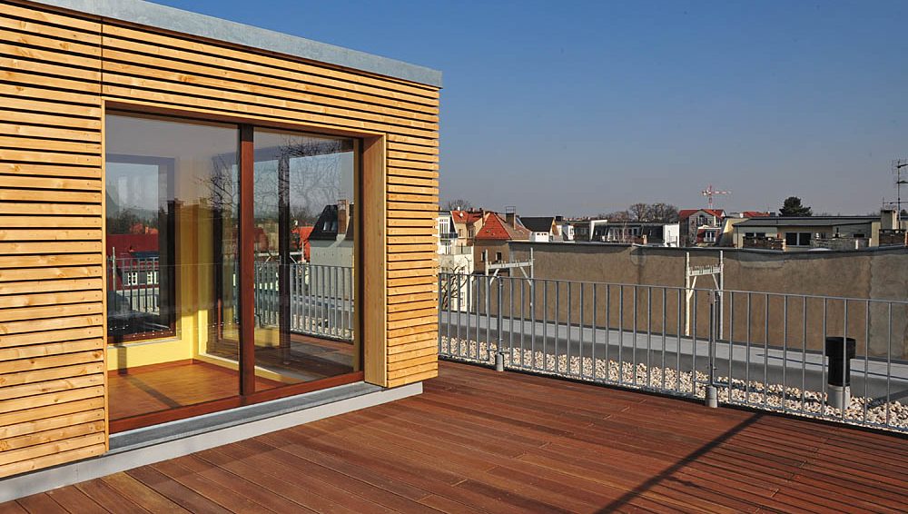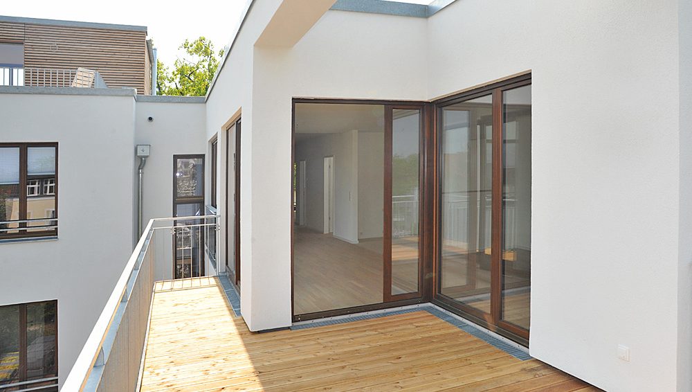 Die hellen kristallinen Putzflächen der Fassade werden ergänzt durch klinker- und lärchenholzverkleideten Flächen, unterbrochen durch großzügige, nahezu bodengleiche Verglasungen. Über einen repräsentativen Eingangsbereich gelangt man über das Treppenhaus bzw. mit dem Aufzug in alle Geschosse. Pro Geschoss erfolgt die Erschließung zweier Wohnungen mit großzügigen Flächenzuschnitten und von den Erwerbern individuell gestalteten Grundrissen.
