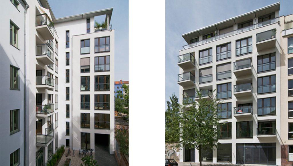 Das Wohnhaus schließt eine durch Kriegseinwirkung entstandene Lücke auf einem ehemals klassisch mit Vorderhaus, Quergebäude und zwei Seitenflügel bebaute Grundstücke in einem gründerzeitlichen Stadtquartier.