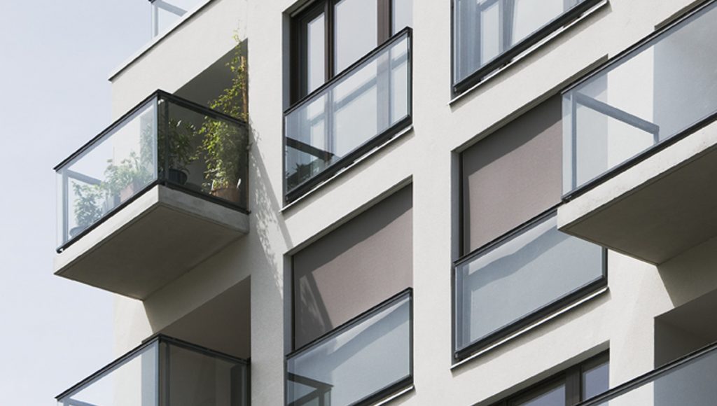 Der siebengeschossige Neubau präsentiert sich selbstbewusst und eigenständig in einer zeitgemäßen Architektur. Die Straßenfassade wird durch ein Raster gleich großer, großzügiger bodengleicher Verglasung im Spiel mit geschoßweise wechselnden, vor die Fassade ausladenden Loggien bestimmt.